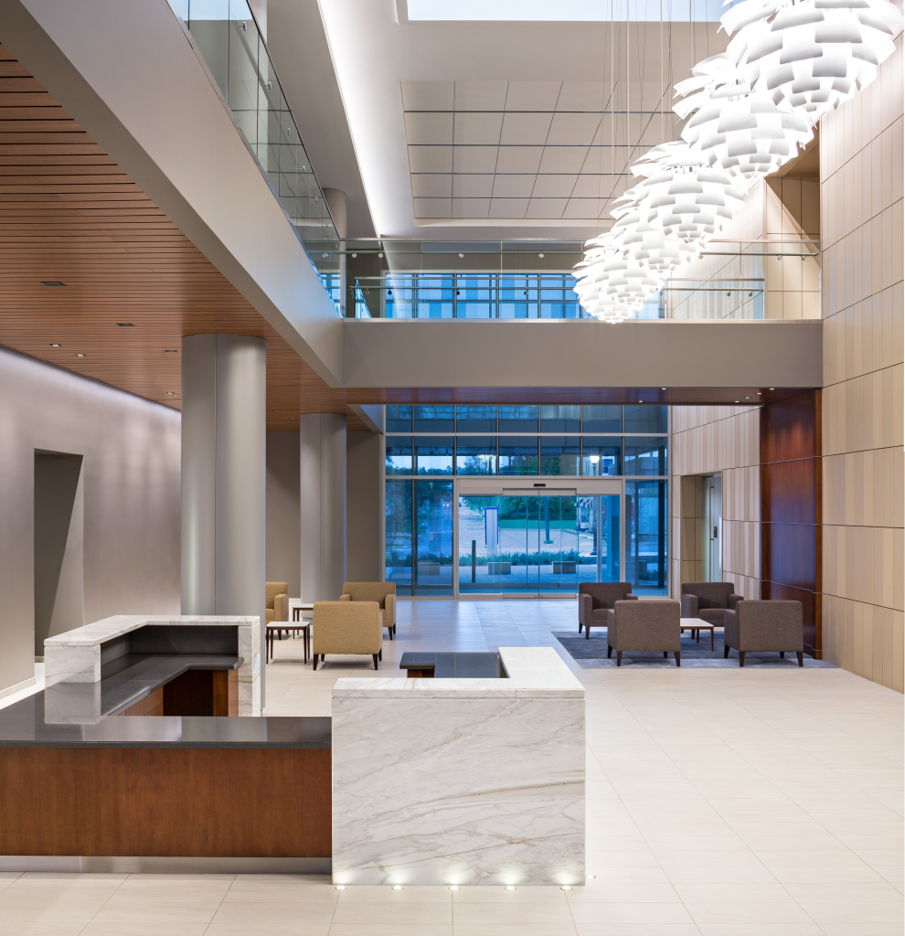 Upon entering the cancer institute, patients are greeted by a grand lobby that incorporates two stories of open space, full glass and natural light, two skylights, architectural lighting, warm wood tones, and the same terracotta tile from the exterior façade. Floor-to-ceiling windows flood the space with natural light, while outdoor gardens and water fountains wrap around the building and enhance the calming atmosphere.