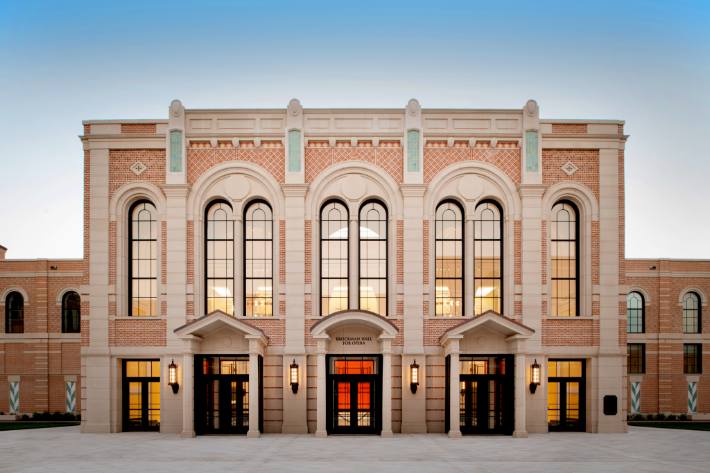 Brockman Hall for Opera (Brockman), fashioned by Allan Greenberg Architect, serves the university’s nationally-ranked Shepherd School of Music. Situated on a spacious five-acre lot, the 84,000 SF performance venue anchors the west side of campus and boasts a distinctly European design. With more than 550,000 handmade bricks laid in seven varying patterns with 12,810 cubic feet of cast stone, the ornate façade is, quite simply, exceptional.