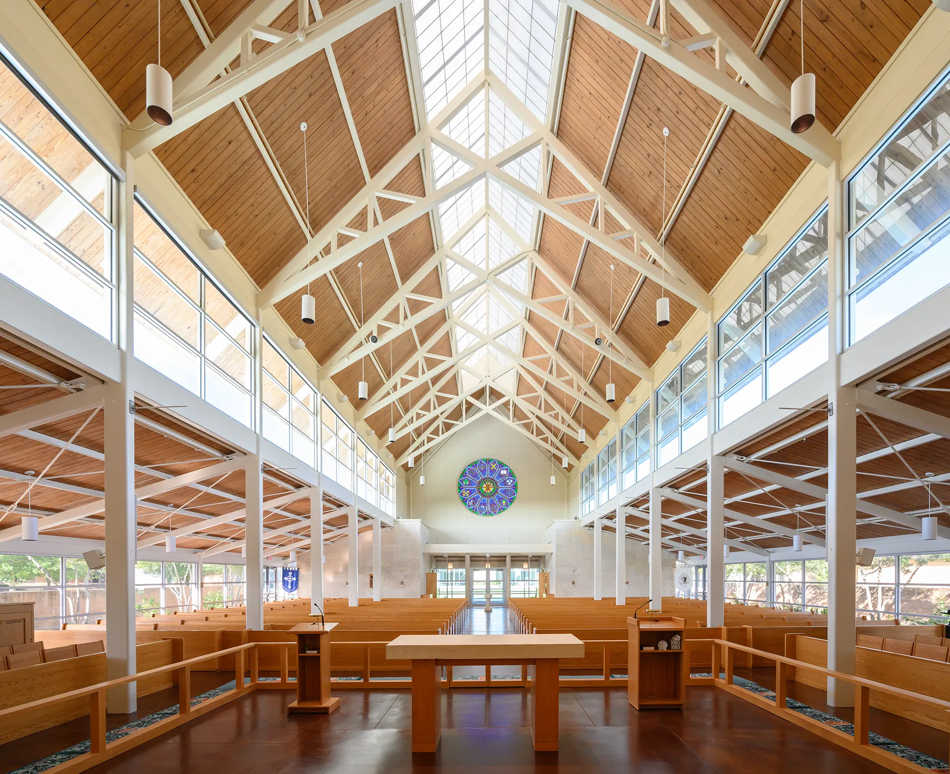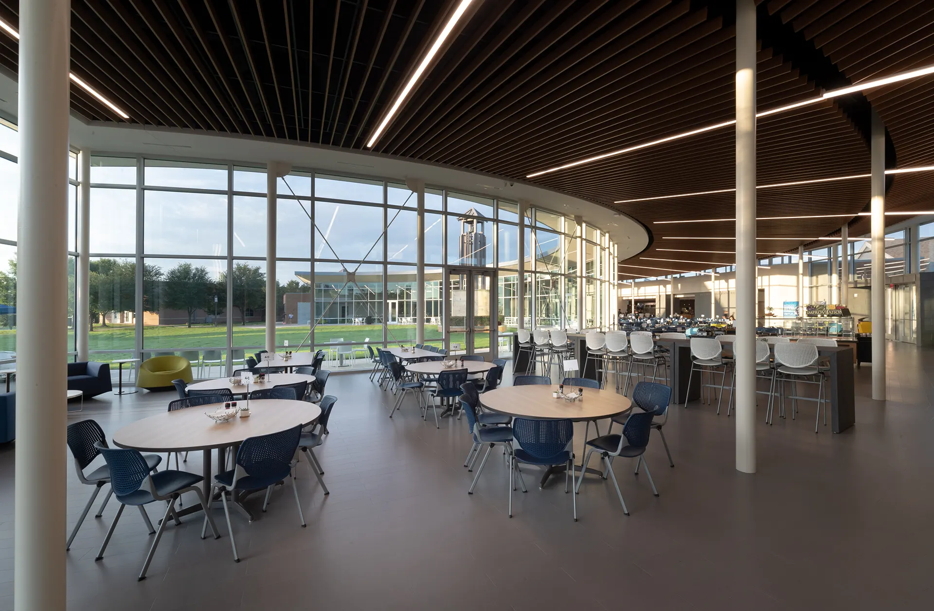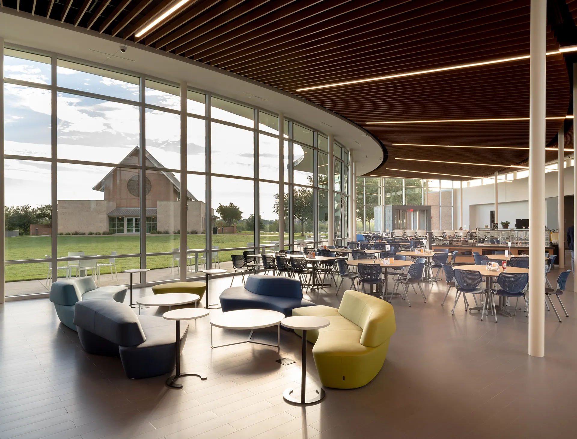 The Sellers and Campbell Union is a new student union, formed to centralize dining areas on campus and provide spaces for collaboration and group interaction at All Saints’ Episcopal School. The building brings together the school as a whole by physically connecting all school buildings from Early Childhood through Upper School to create opportunities for “planned collisions.” The student union includes a kitchen, administrative suites, a private dining area, student breakout rooms, conference rooms, and outdoor seating. Across from the union, Linbeck also renovated and expanded the All Saints’ Chapel to create greater seating capacity; enlarge the chancel and alter area; enhance screen walls at the front elevation; add an electronic pipe organ; and incorporate new skylights, primary mechanical equipment, ADA pathways, and landscaped prayer gardens.