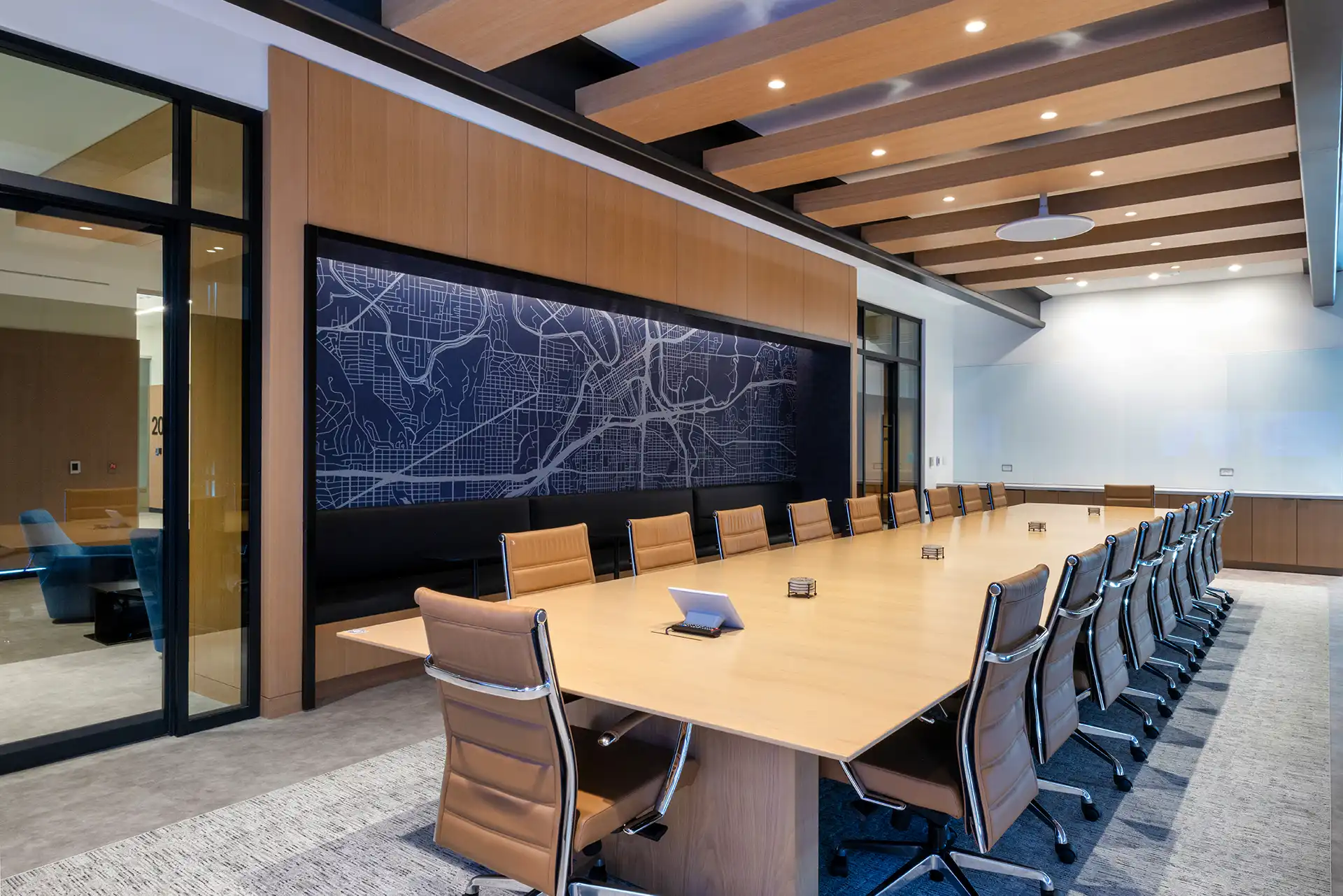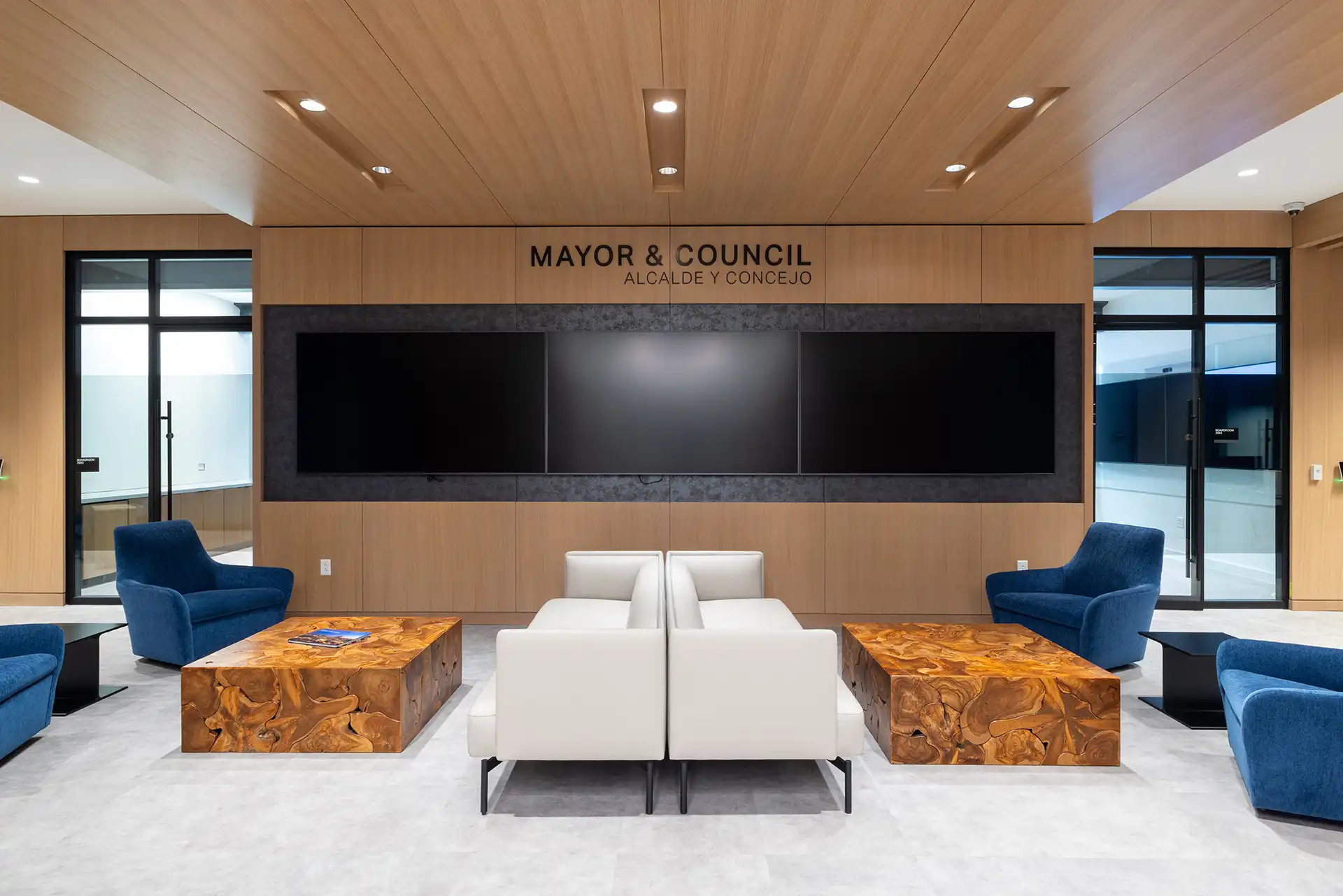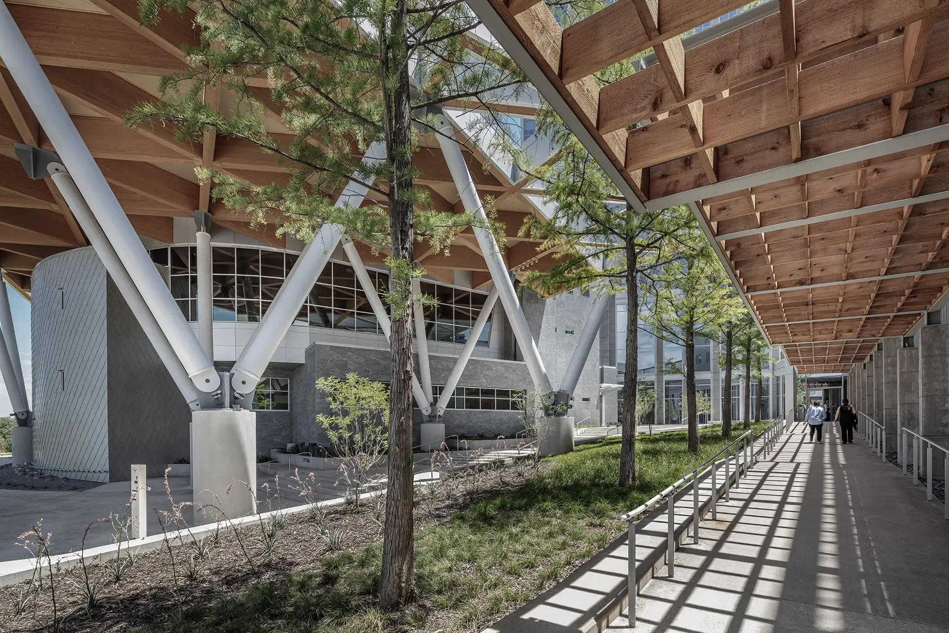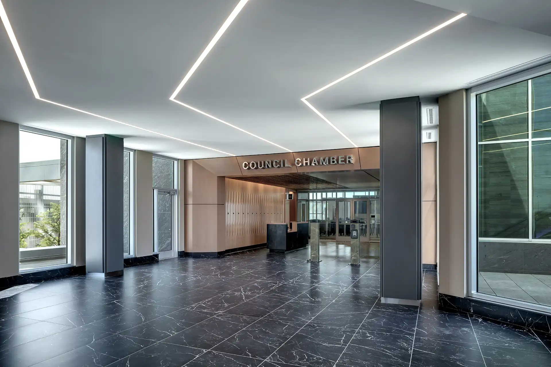 Fashioned out of the former Pier 1 Imports Corporate Headquarters, New City Hall was the result of a major renovation and expansion project for the City of Fort Worth. Renovations were reserved for the existing tower, which now contain flexible floor plans for more than 23 city departments and more than 1,000 employees. The expansion was dedicated to building a new Council Chambers building—an intricately designed facility equipped with theater-style seating for 244, sound amplification capacities, broadcast capabilities, and interactive software displays at each of the city council seats. The two-story lobby includes a media room and workroom for all to use prior to council meetings. Along with the renovated tower and new Council Chambers, the project also called for a reconfigured parking garage to accommodate the more than 1,400 staff and visitors, and introduced new outdoor spaces to create a more welcoming, pedestrian-friendly environment.
