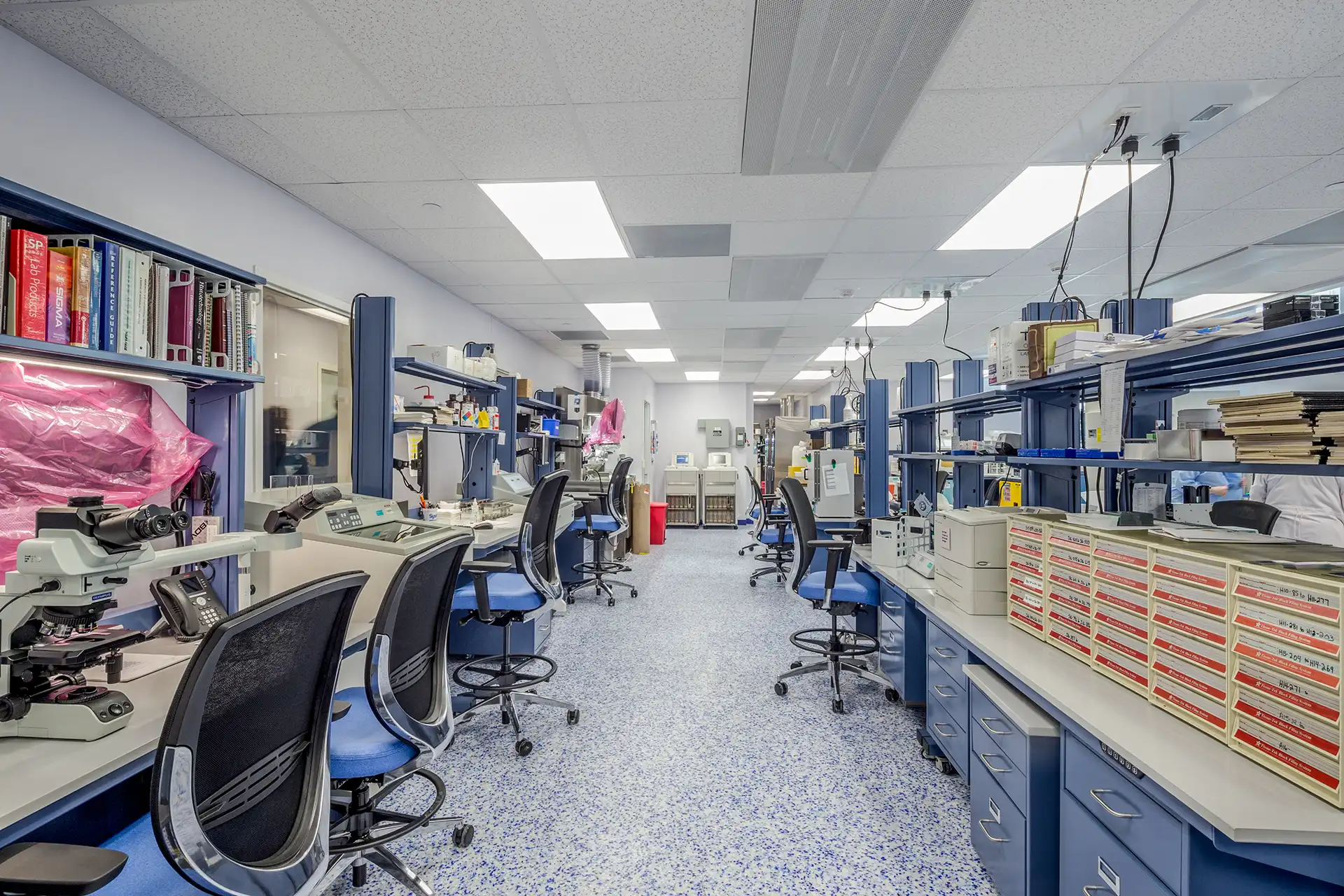 Designed with flexibility and future growth in mind, this innovative open-concept facility redefines the functionality of clinical and research spaces. Mobile workstations and ceiling-mounted power and data connections maximize floor space, streamline future upgrades, and allow the environment to adapt to evolving needs. Our team led extensive MEP coordination to support the integration of critical medical equipment while ensuring compliance with all healthcare regulations. We partnered closely with vendors to map efficient delivery and installation paths for large analyzers and specialized devices. The facility consolidates a wide range of services under one roof—including a specimen center, blood bank, histology, microbiology, molecular specialties, mass spectrometry, research and development, and administrative offices—creating a highly functional space that enhances daily operations, strengthens research capabilities, and improves patient outcomes.