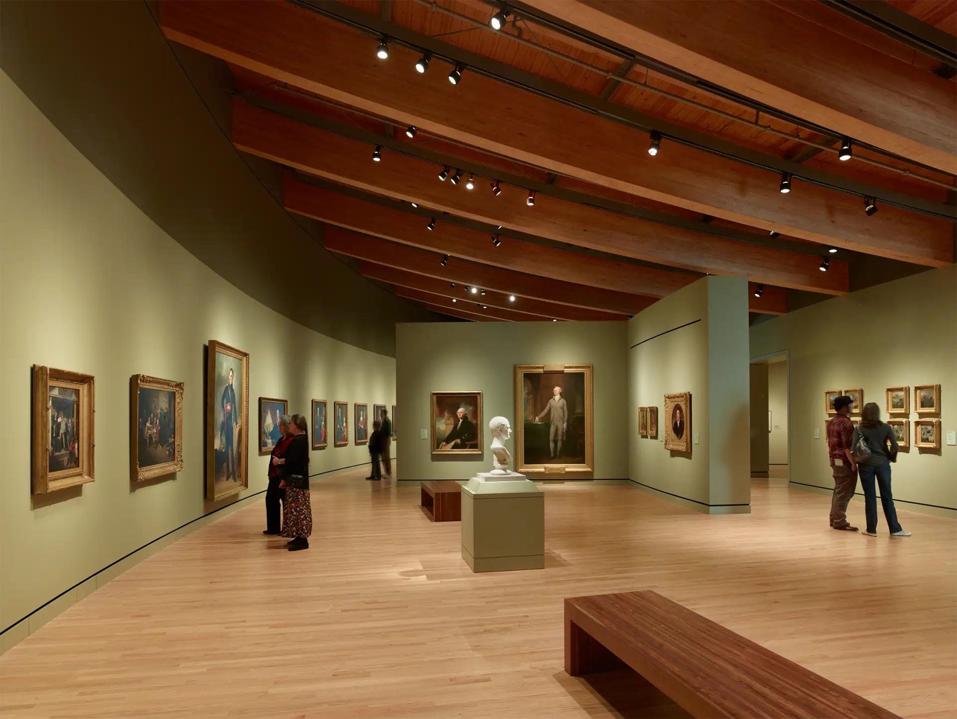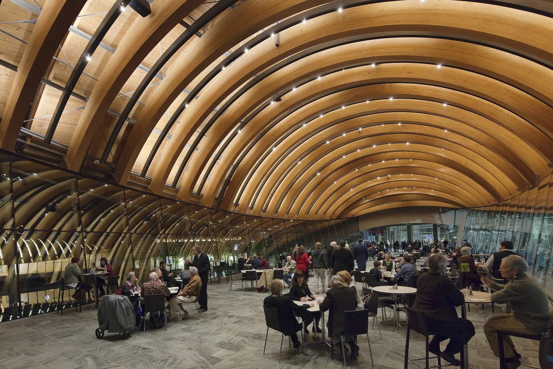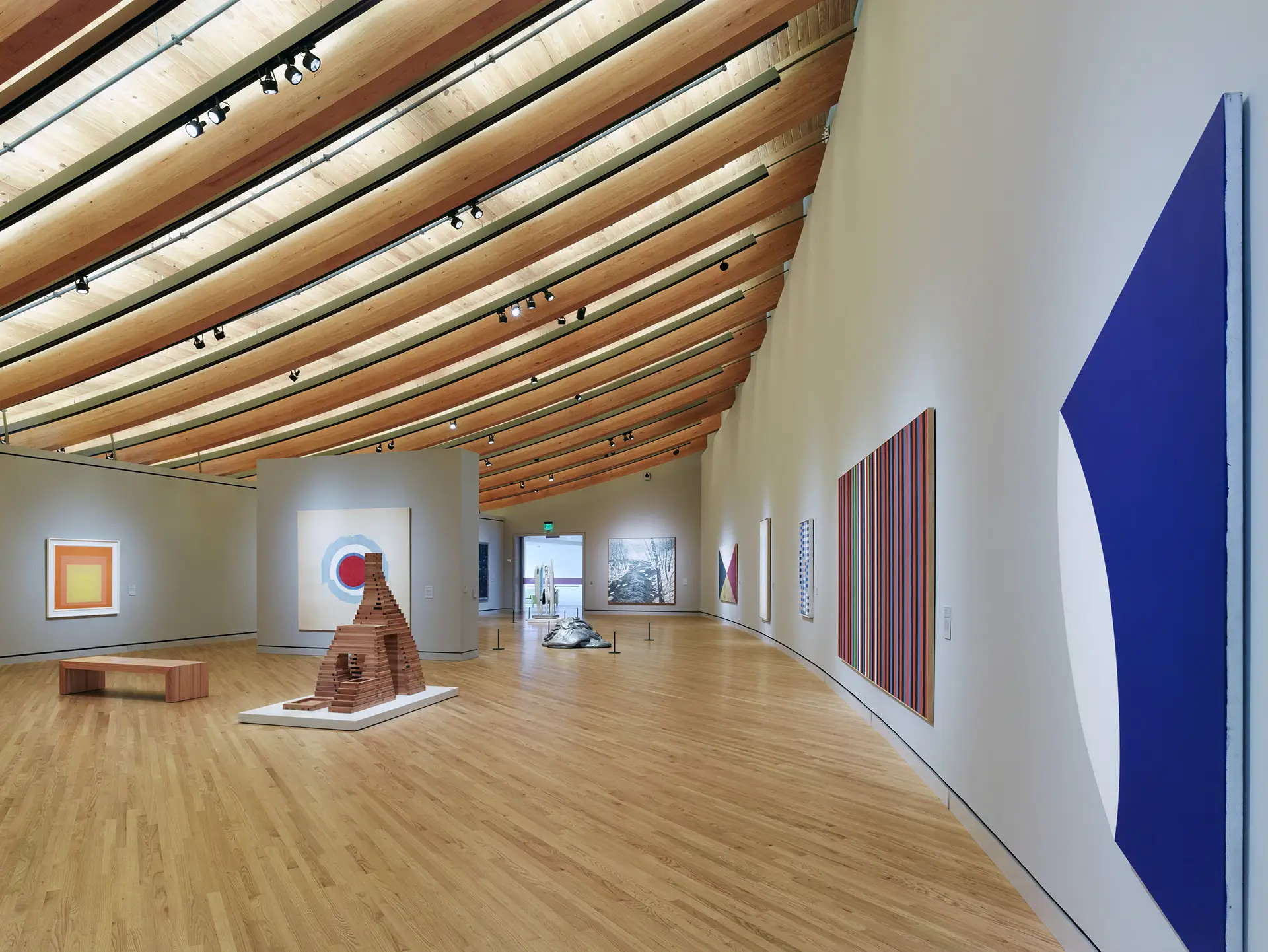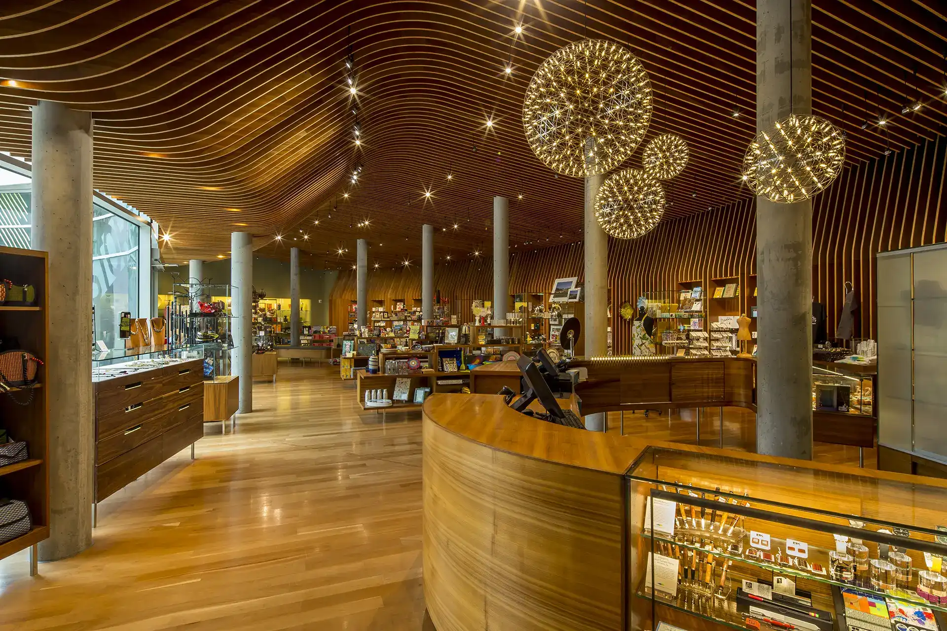 Surrounded by the beauty of the Ozarks, the Crystal Bridges Museum of American Art positions art and nature side-by-side. As a collection of pavilions, the museum sits tucked inside the environment’s sloping terrain and spans a ravine among two ponds, forming a unique framework for galleries, educational areas, and event spaces. Utilizing architectural concrete, the internationally acclaimed architect sculpted the museum structures into the landscape and crafted various curves and dimensions to create a visual experience for the public, stretching from the procession of vehicular drop-off to the galleries. The museum’s nod to the outdoor environment extends into the building materials, which highlight the surrounding forest and spotlight the craft traditions of Arkansas, “The Natural State.”