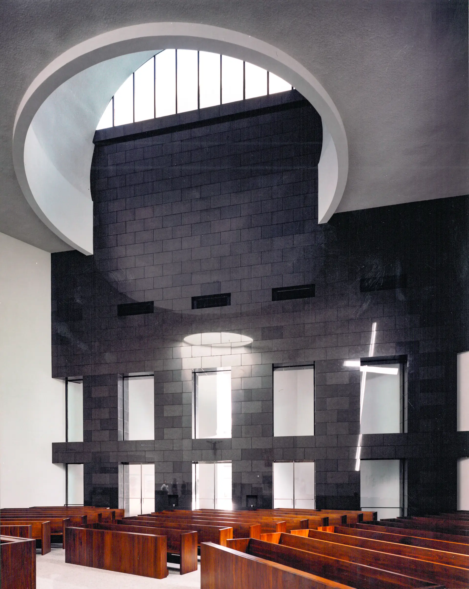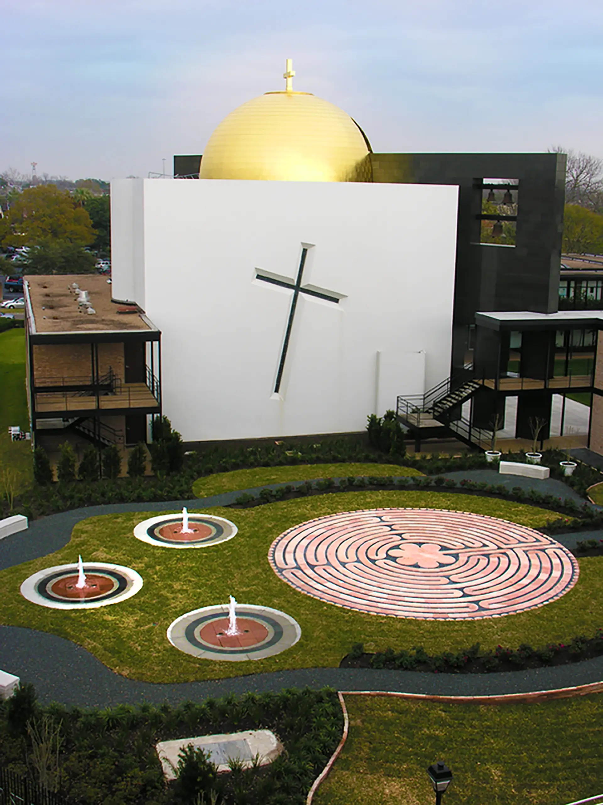 The Chapel of St. Basil is a focal point on the campus of the University of St. Thomas in Houston’s historic Montrose neighborhood. Designed by renowned architect Philip Johnson, the 70-foot-tall precast structure mixes contrasting colors and textures to achieve its unique profile, such as white plaster, a gold-leaf dome, and a black granite wall measuring 115 feet in length, 57 feet in height, and more than three feet in thickness. Three polished brass bells, symbolizing the Holy Trinity, complete the structure. Inside the chapel walls, natural lighting from a cross-shaped window inspire reflection and prayerfulness, while a sculpted, black royal impala granite altar, 14th-century crucifix, and pews cut from native Texas trees are positioned to welcome visiting congregants.