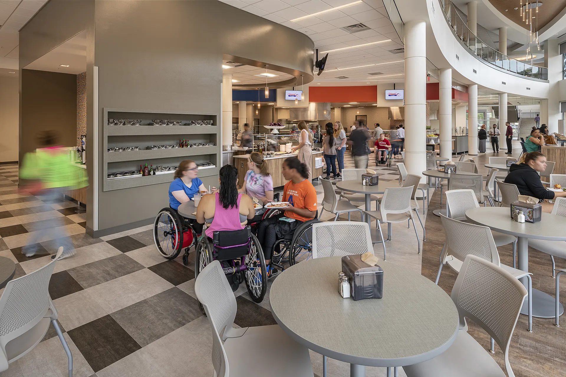 The Commons is a multi-use student center that offers a variety of dining options for students and collaborative workspaces and meeting rooms, utilized by student organizations, campus departments, and fraternity and sorority groups. Lounge areas and outdoor seating have been strategically placed to create a welcoming and centralized gathering point for student life activities on the west campus. The multi-functional building also serves as an event center for campus-wide functions. The building was designed and constructed to support sustainability and be appropriately sized to fit with the aesthetics of the surrounding campus. The centralized location of the building was selected due to its primary access to the new dormitory facilities currently being constructed and to act in conjunction with the Maverick Activities Center.